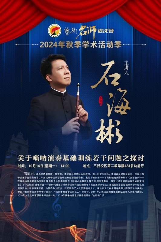 嘉宾简介:石海彬,著名唢呐演奏家、教育家,中央音乐学院民乐系教授、博士研究生导师,中国音乐家协会会员、中国民族管弦乐学会常务理事、中国民族管弦乐学会啖呐专业委员会会长。出版《普天乐—石海彬唢呐演奏专辑》《国乐金声—石海彬协奏曲新作品专辑》等多张个人独奏专辑及《唢呐必学教程》等近10部专业教材;撰写《试论对唢呐音色的审美追求》《守正创新 兼收并蓄—新时代背景下啖呐专业学科建设的思考》等多篇学术论文;策划组织多届全国唢呐学术会议及展演活动。教学成果卓著,为国内各大院校、院团培养了大批优秀唢呐人才,学生多人次在全国各类重大赛事活动中获奖。