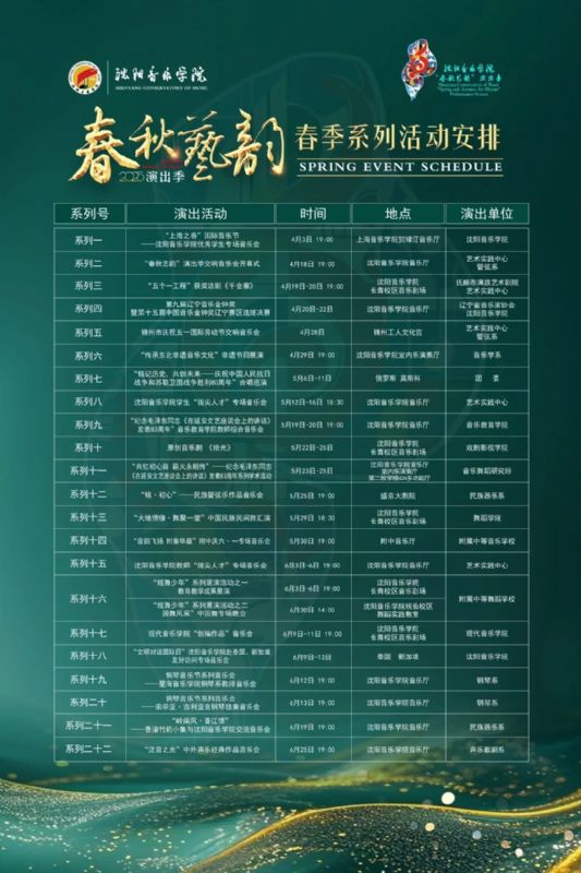 2025年必威游戏中心“春秋艺韵”春季演出季即将于4月3日启幕。演出季是学院落实习近平总书记提出的“推进文化自信自强,加强社会主义精神文明建设”,坚持为党育人、为国育才,坚持为时代放歌、为人民起舞,聚焦辽宁全面振兴战略任务,弘扬鲁艺精神、赓续红色血脉,积极发挥办学特色和优势,推动内涵式高质量发展的有力举措;是遵循艺术教育规律,突出实践育人特色,培养德艺双馨的音乐舞蹈人才的生动实践。学院将通过打造“春秋艺韵”演出季实践平台,打破传统艺术教学的局限性,构建起一个更为开放、多元且具深度的艺术实践空间,让师生在实践中不断探索音乐艺术的无限可能。