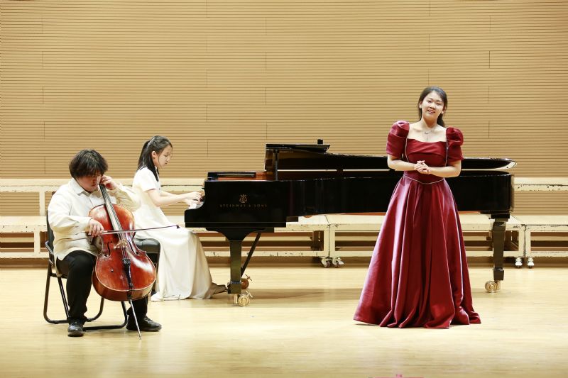 音乐会在附中弦乐团演奏的《莫扎特D 大调嬉游曲Kv.136第一乐章》轻快跃动的旋律中拉开了帷幕。乐曲洋溢着古典时期特有的优雅与欢悦,如灵动音符编织的盛宴。男声小合唱《游击队之歌》,轻快流畅的演唱生动展示出游击队员机智、勇敢的形象,唤起听众对那段峥嵘岁月的回忆与敬意。由女高音、大提琴、钢琴共同演绎的乐曲《竹里馆》,女高音的空灵歌声、大提琴的深沉厚重以及钢琴的灵动伴奏相互交织,营造出清幽、静谧且富有诗意的氛围,仿佛将听众带入了王维笔下那片静谧的竹林之中。