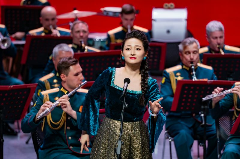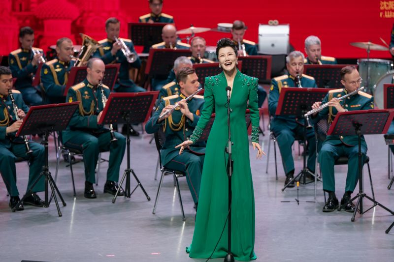 音乐会在俄罗斯功勋艺术家季莫费·马亚金少将指挥的柴可夫斯基《第四交响曲》终章的磅礴声浪中启幕。这部“命运抗争”的史诗,令观众仿佛置身硝烟弥漫的战场。歌曲《芦花》,演唱者以空灵的嗓音勾勒江南水韵,与俄罗斯民歌《毡靴》的“冬日幽默”形成诗意对话。维吾尔民歌《一杯美酒》热情奔放;巴拉莱卡琴奏响的《节日庆典》再现了斯拉夫民间婚礼的狂欢场景;歌曲《在希望的田野上》饱含对美好生活的赞美;歌曲《春天的芭蕾》《俄罗斯上空飞行》,演唱者以高超的演唱技巧引发观众赞叹;《五月华尔兹》经典的旋律将观众回到1945年那个鲜花漫天的胜利之春,《莫斯科郊外的晚上》《喀秋莎》熟悉的旋律则将全场气氛推向高潮,观众长时间起立鼓掌,致敬这场跨越80载的音乐对话。