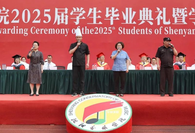 保安王勇、保洁刘丽、厨师王子宾、宿舍管理员王丽作为代表的工勤人员上台为毕业生送祝福