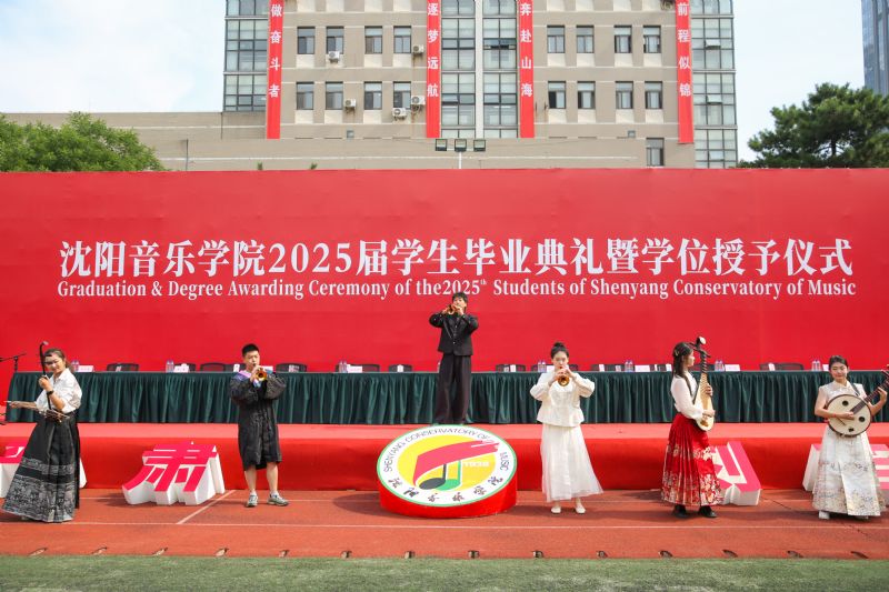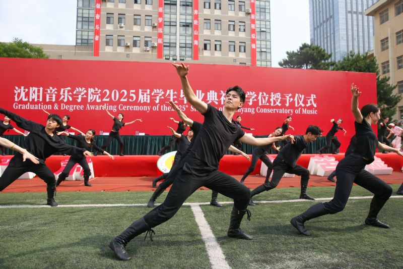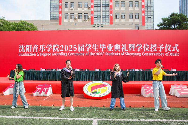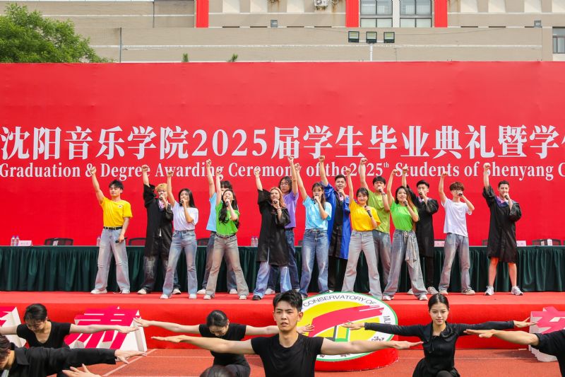 典礼开始前,“川子唢呐”——2015届校友孙名川与民族器乐系14名学生、现代音乐学院4名学生联袂演奏电影《哪吒·魔童闹海》主题曲《就是哪吒》,高亢嘹亮的唢呐声与动感十足的电音节奏激情碰撞,展现了民族乐器与现代电音的完美融合,瞬间点燃全场的激情。“少年应有鸿鹄志,敢踏风浪破苍穹”,随后舞蹈学院40名学生表演了洒脱俊美的蒙古族舞蹈,他们扬臂似鸿雁高飞,轻踏如骏马踱步,既象征着2025届毕业生“天高任鸟飞”的宽广未来,也寓意着毕业生们“骏马踏平川”的美好图景。“踏浪驭飞舟、千帆竞出征”,现代音乐学院、国际教育学院15名学生与声乐歌剧系8名学生梦幻联动合唱歌曲《当离别开出花》《未来我来》,流行韵律交织美声咏叹,时尚与古典共鸣,唱出了sxaqs学子逐梦前行、奔赴山海的自信从容和未来我来、勇担使命的挺膺担当。全体毕业生牢记母校嘱托,传承红色基因,赓续红色血脉,在民族复兴的征程上展现sxaqs学子的青春风采,施展艺术才华报效家国。
