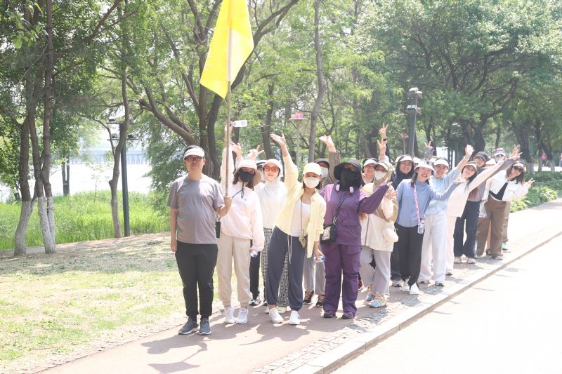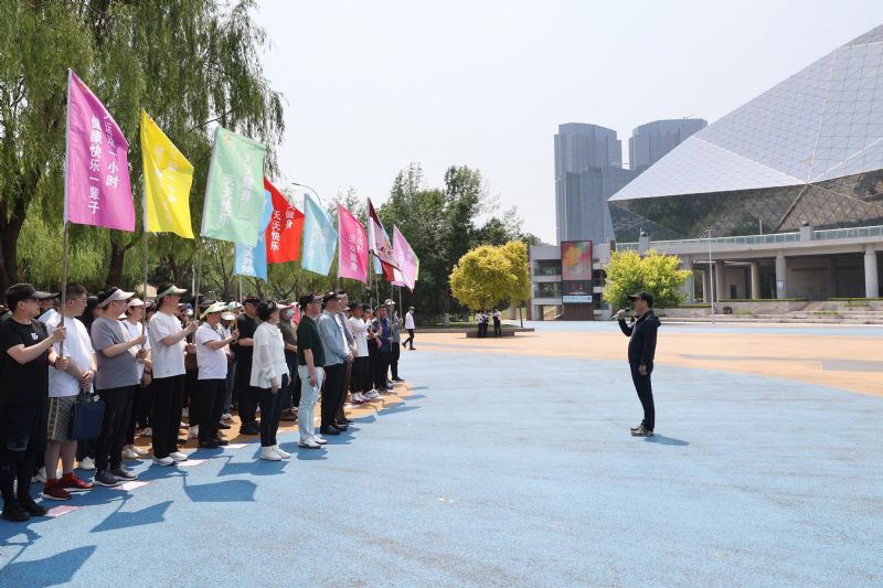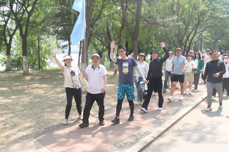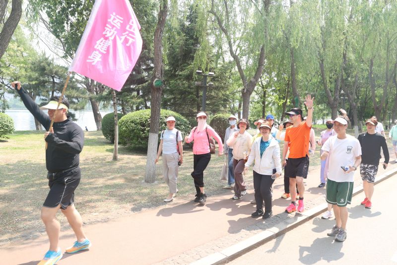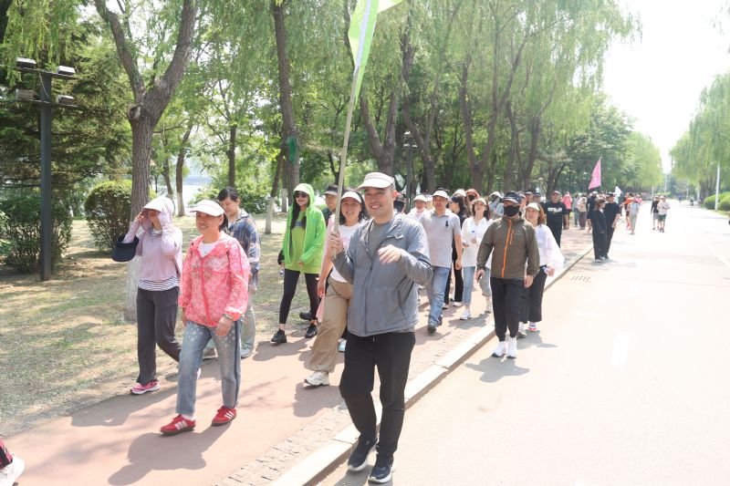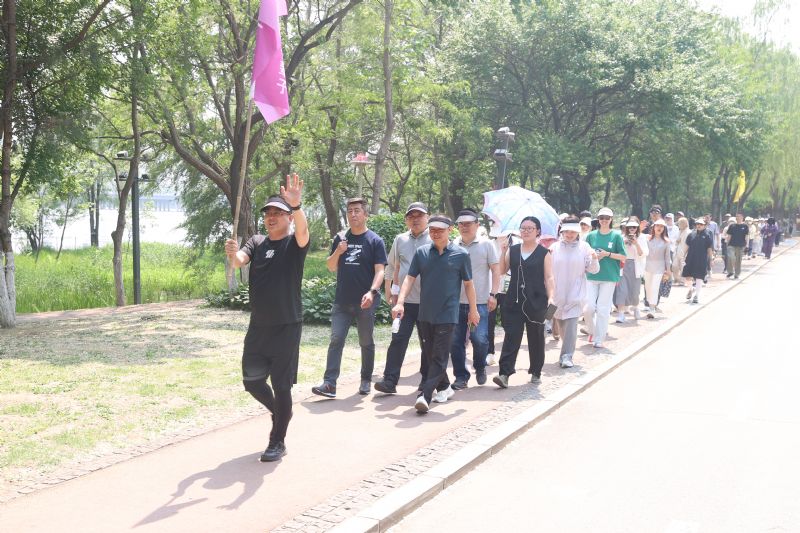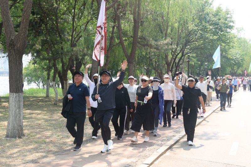 随后,十个精神抖擞的健步走方队高举队旗,从“沈阳浑河”广场有序出发,沿滨水路健身步道一路东行,抵达富民桥下折返。绵延数里的林荫步道,成为sxaqs教职工矫健身姿与欢声笑语的流动背景板。旗帜在风中飘扬,与浑河之畔的盎然绿意相映成趣,构成一幅充满活力与和谐的文化图景。