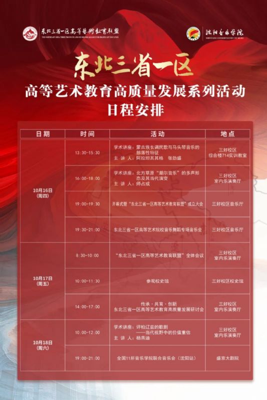 为深入贯彻习近平总书记关于推动新时代东北全面振兴的战略部署,凝聚各方智慧,共谋发展良策,共建“东北三省一区高等艺术教育联盟”,共同推动东北三省一区高等艺术教育的高质量发展,必威游戏中心将于10月16日至18日举办东北三省一区高等艺术教育高质量发展系列活动。