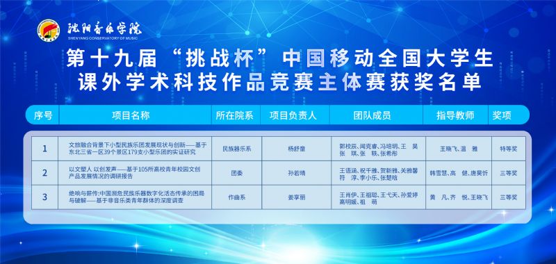 本届赛事取得优异成绩,是学院长期以来高度重视创新创业教育、深耕学术科研训练、扎实做好人才培养工作的集中体现与丰硕成果。这生动彰显了学院坚守为党育人、为国育才的初心使命,积极融入辽宁全面振兴发展大局,依托音乐学科专业特色,不断深化人才培养机制改革,扎实推进人民满意的高水平艺术教育建设所取得的扎实成效。未来,学院将以此历史性突破为崭新起点,紧紧围绕立德树人根本任务,以“挑战杯”等高水平竞赛为牵引,持续打造富有活力的青年学术科技创新团队,深化“以赛促学、以赛促创、以赛促教”育人机制,激励更多学子在科研创新与艺术实践的融合中,以创新为笔、以奋斗为曲,在时代的舞台上奏响更加璀璨的青春乐章!