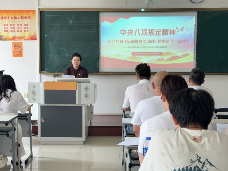 她深刻阐释了中央八项规定精神的核心要义,剖析其蕴含的马克思主义执政党建设规律,强调其作为新时代加强作风建设金色名片的永恒价值和强大生命力,是推进党的自我革命的重要实践。深入分析了当前作风建设面临的新形势新任务,指出在复杂环境下,青年一代需要保持清醒头脑,自觉抵制歪风邪气,将中央八项规定精神内化于心的行为准则。她特别强调新时代音乐人的光荣使命,必须将优良作风融入艺术生命,并号召师生,一要以崇德尚艺为根本,追求德艺双馨;二要以人民为中心,创作无愧于时代的精品力作;三要坚守艺术理想,用干净纯粹的作风和昂扬向上的作品,在实现民族复兴的壮阔征程中奏响最铿锵有力的时代强音。