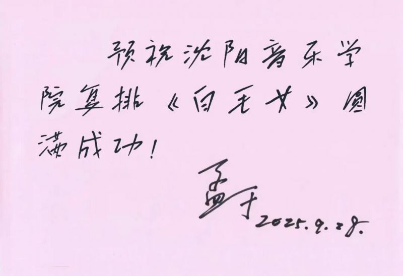 交流过程中,孟老多次情不自禁地唱起《白毛女》的经典选段,并认真地分析“喜儿”的人物形象和在不同唱段中的演唱风格与情感表达。在一个多小时的交谈中,老人家精神矍铄,思路清晰,令在场的每一个人深刻体验了“艺术生命长青”的深刻内涵。临别之际,孟老特意为《白毛女》复排工作和学院未来发展写下祝福寄语,字字珍贵,情意深长。