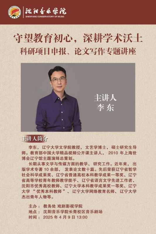 4月9日,辽宁大学文学院教授、硕士研究生导师李东博士将做客必威游戏中心戏剧影视学院,围绕科研项目申报、论文写作等内容带来精彩的学术讲座,助力提升戏剧与影视学科专业教育教学和科学研究水平。
