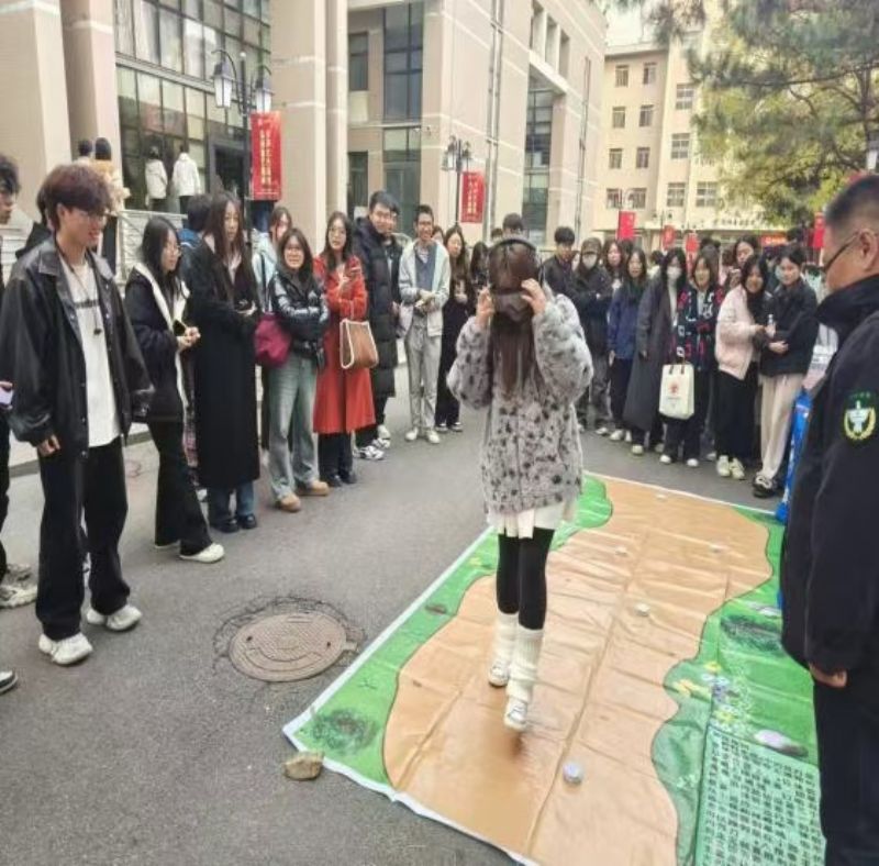 现场,还加入了互动环节,同学们可通过大屏幕进行图像采集,进行吸毒前后的面部照片对比。以及户外游戏直观体验,模仿致幻精神状态下人的意识,更加真实的体验到毒品对身体的巨大危害。