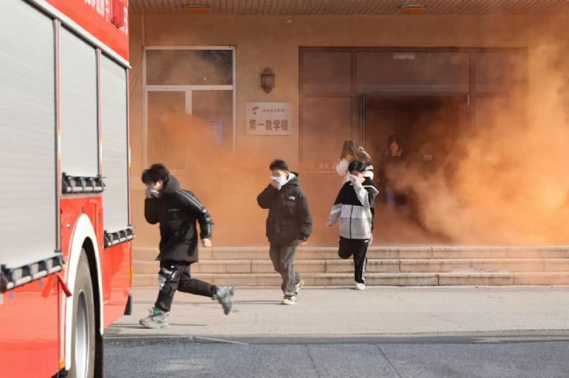 随后开展火灾疏散逃生演练,学校对此次活动制定演练方案,组织全体师生对演练步骤、疏散路线、演练注意事项进行学习。培训人员引燃模拟烟雾弹,师生听到火警警报声后迅速反应,在极短的时间内,按照预定的疏散路线,有序的从教室安全的撤离到操场。
