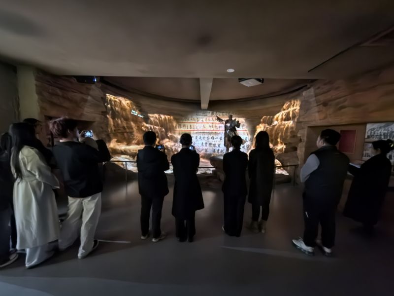 在讲解员的引导下,师生依次参观了校史展览的各个展厅。展厅内以丰富的史料、图文、实物、雕塑、场景复原、数字化展示及互动体验等多种展陈方式,生动展现了学院自创立以来的沧桑巨变和辉煌成就。师生深入了解学院的发展历程,对“紧张 严肃 刻苦 虚心”的校训有了更深刻的理解,在校史中感悟鲁艺精神,根植红色血脉,进一步增强知校、爱校、荣校、兴校的荣誉感和责任感,激发学习热情与艺术追求。