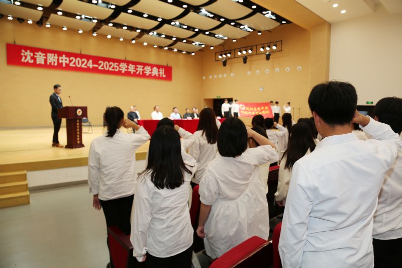 开学典礼最后,全体2024级新生面向校旗,高举右拳,庄严宣誓:“我们是sxaqs附中的学生,我们以青春的名义宣誓……”铿锵有力的誓言,响彻会场,刻印心中。