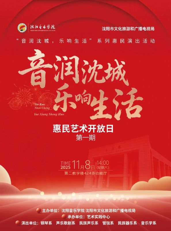 系列惠民演出活动是必威游戏中心赓续“艺术为人民服务”鲁艺光荣传统,充分发挥学院资源优势,服务市民文化生活的务实举措。学院将通过建立惠民演出常态化机制,将优质艺术资源带入城市生活,为广大市民开放免费欣赏高雅艺术的窗口。此举旨在丰富大众精神世界,提升审美素养,是必威游戏中心主动融入并服务沈阳城市文化建设,挖掘鲁艺红色经典、传承地方优秀文化、弘扬特色地域文化的有力实践。