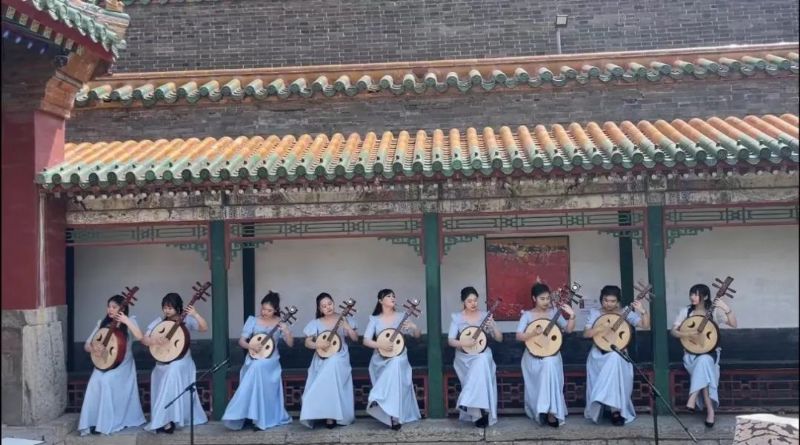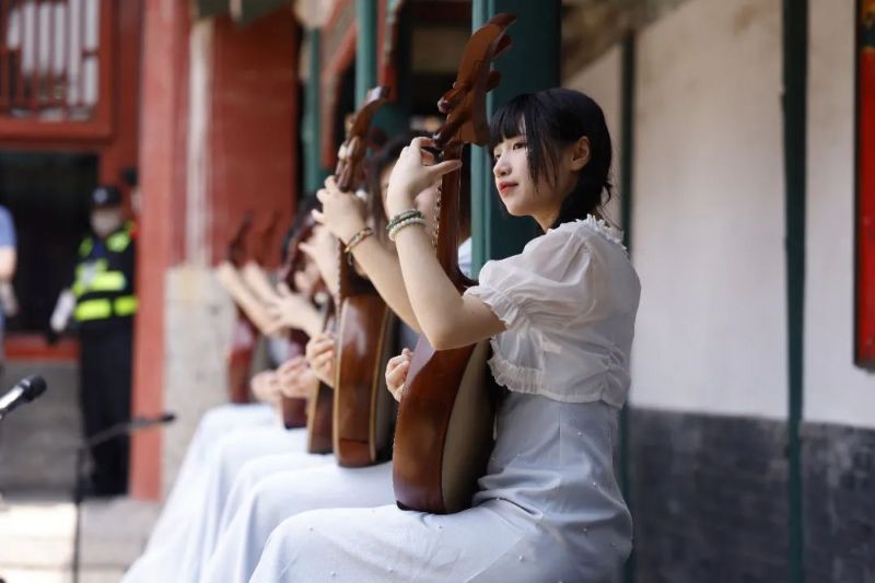 在保极宫,我院民族器乐系“梅朵”阮族乐团的同学们先后演奏了具有浓郁中国风色彩的《丝路驼铃》《龙马精神》等6首作品。
