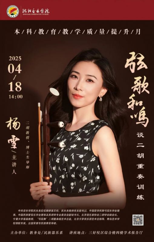 讲座以“弦歌和鸣——谈二胡重奏教学”为题,从二胡重奏的现状出发,根据当代专业院校学生的演奏水平,详细分析、讲解重奏训练的诸多步骤及演奏要点。杨雪教授与“弓弦舞”重奏组四位成员学生将示范演奏多首经典重奏作品,把讲座中的要点内容融入示范演奏中。曲目包括:二重奏《良宵》《阿拉木汗》、三重奏《嬉戏》《玉米粉上的雀鸟》、四重奏《无垠大地》《弓弦舞》《采红菱》等。公开课,将聚焦几位sxaqs学生的演奏,或独奏、或重奏。力求通过此次活动的举办,增进二胡从独奏到重奏的多元创新发展,展现二胡在教学和演奏方面的当代风貌。