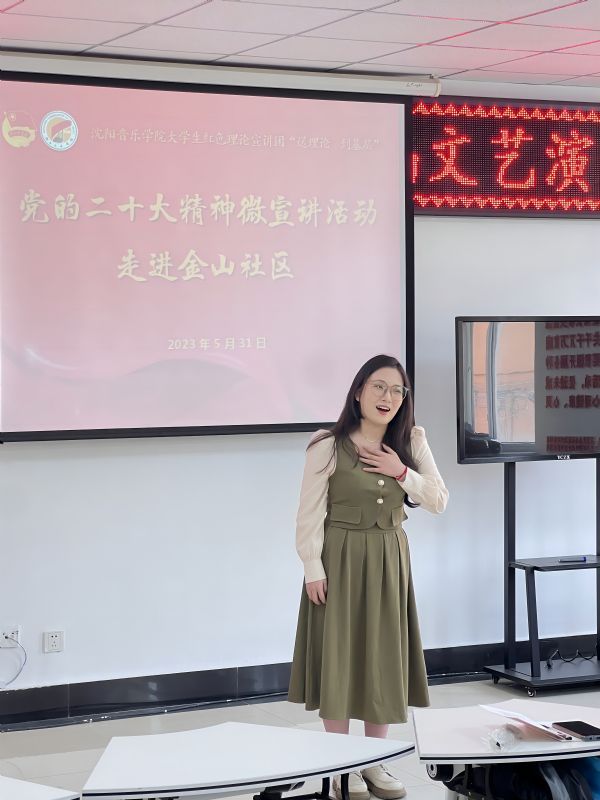 党的二十大召开以来,团委把学习宣传贯彻党的二十大精神作为首要政治任务,充分发挥我院大学生红色理论宣讲团的教育引领作用和宣讲团成员专业优势,聚焦党的二十大精神,分众分层持续开展“党的二十大精神微宣讲”活动。连日来,宣讲团成员走进金山社区、葵花社区、沈阳市第一七六中学、鲁迅美术学院,向基层党员群众和在校青年学生宣讲党的二十大精神,将理论宣讲与社会实践相融合,让党的创新理论入脑入心。