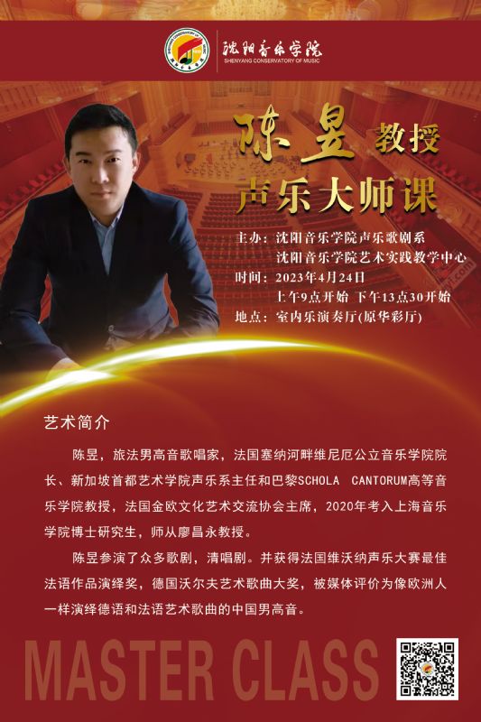 为切实培养适应新时代发展、满足市场需求的高层次人才,提高学生专业水平和表演能力,声乐歌剧系充分利用艺术实践周,立足实际,开展形式丰富的学术交流活动。4月24日,邀请旅法男高音歌唱家、法国塞纳河畔维尼厄公立音乐学院院长、新加坡首都艺术学院声乐系主任和巴黎SCHOLA CANTORUM高等音乐学院教授、法国金欧文化艺术交流协会主席陈昱教授为学生做大师课讲学。