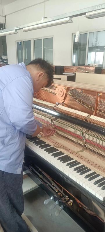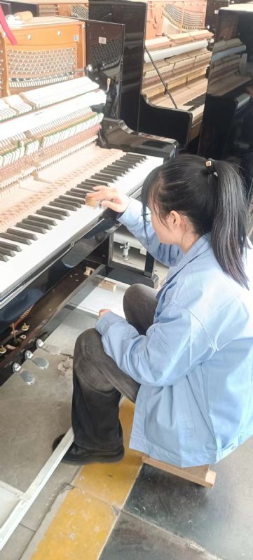 二翻是通过拧卡钉调整开门距离,调整钢琴键盘,包括键深、键高、键间距,对头番的工作进行精细调整。