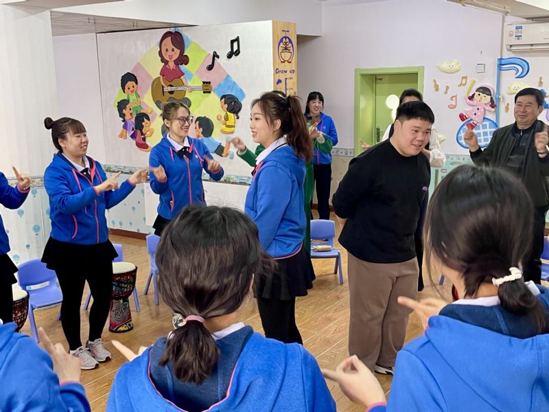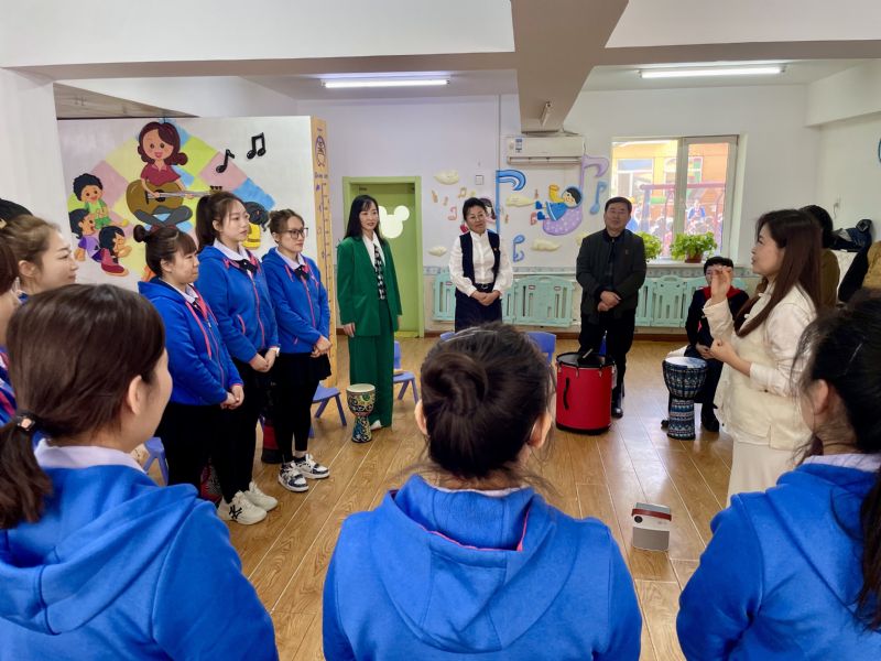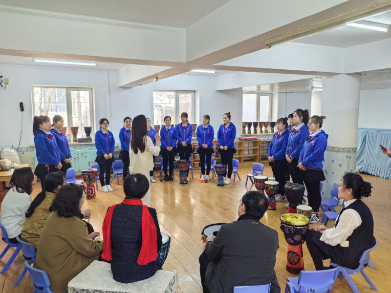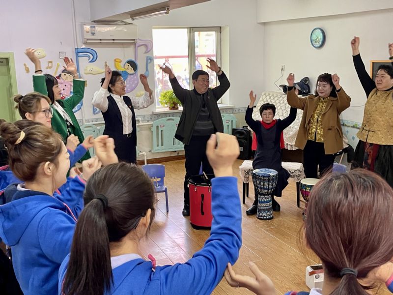 活动中,音乐科技系乐音与健康专业的师生积极发挥专业优势助力此次活动。在音乐疗愈室,乐音与健康教研室主任史美馥带领园内的老师们体验了节奏律动、即兴乐器合奏和鼓圈活动,让老师们在律动中释放压力,感受音乐对身心的深层疗愈,并体会不同技术对专注力、观察力、模仿能力、合作能力的培养。音乐科技系师生与启智幼儿园的老师们一起互动,现场气氛热烈且温馨。