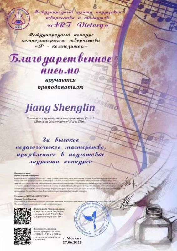 在2025年俄罗斯“作曲家”国际作曲比赛中,作曲系2024级研究生史皓元创作的室内乐作品《幽夜觅踪》荣获一等奖。(指导教师:姜盛林)