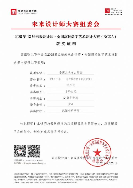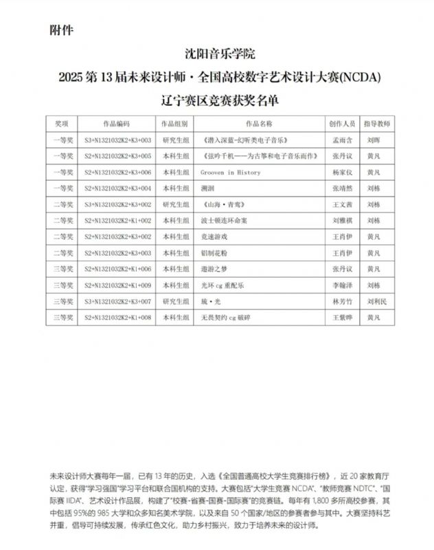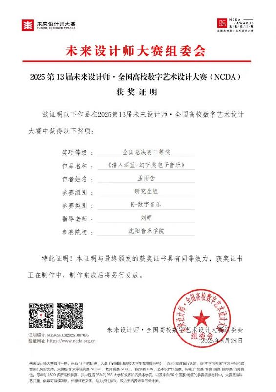 在刚刚圆满落幕的2025年第13届未来设计师·全国高校数字艺术设计大赛(NCDA)竞赛中,作曲系师生踊跃参与,凭借扎实的专业功底与卓越的创新能力,在省赛和国赛中,取得了优异的成绩。