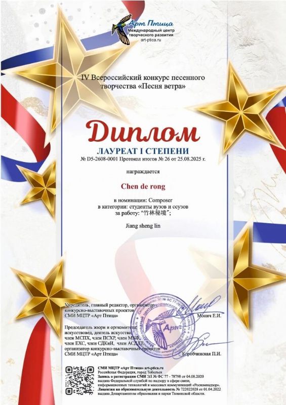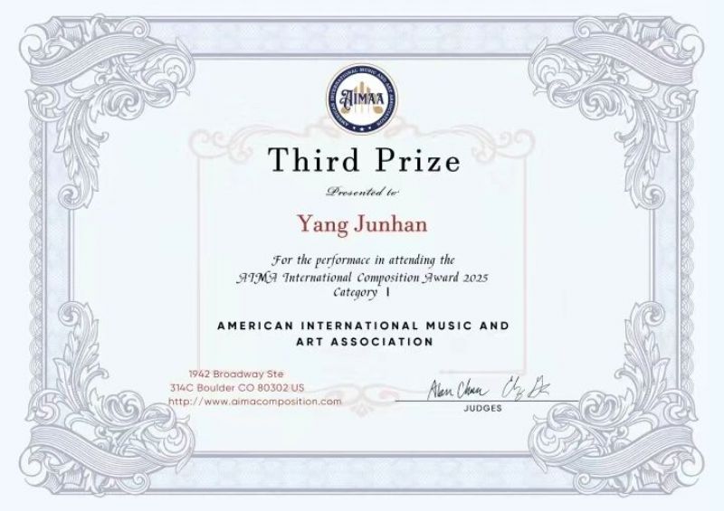 在2025年全俄原创作曲大赛中,作曲系2022级本科生杨珺涵创作的大型室内乐作品《Topological》荣获二等奖(第三届)(指导教师:王姝蕴)。 作曲系2022级本科生陈德荣创作的中西混合室内乐作品《竹林秘境》荣获一等奖(第四届)(指导教师:姜盛林)。在第三届AIMA国际作曲比赛中,作曲系2022级本科生杨珺涵创作的大型室内乐作品《Topological》荣获三等奖(指导教师:王姝蕴)。