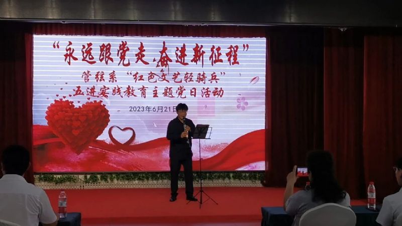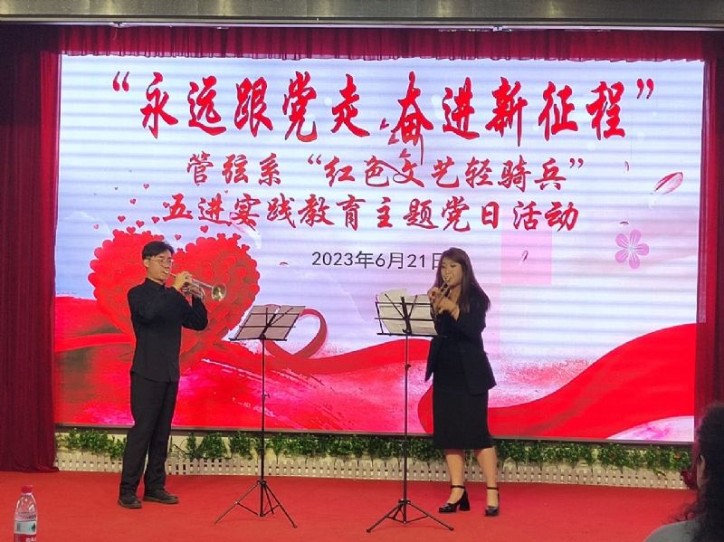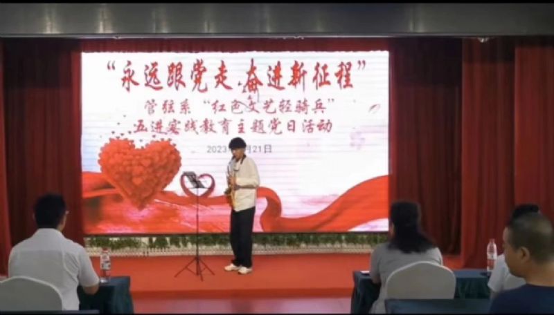活动中,我系文艺轻骑兵积极参与到“永远跟党走 奋进新征程”的志愿服务演出中,2021级学生陈子阳以单簧管独奏《苏北调变奏曲》开场,赢得观众阵阵掌声;2020级学生孙路翔演奏的《梁祝》旋律凄美婉转、荡气回肠,观众很快被带入情境;2021级学生代京辰、陈子阳合奏的《一步之遥》热情奔放,展现了当代大学生积极向上的精神面貌;2020级学生韩佳君、孙路翔合奏的《月亮代表我的心》《亲爱的旅人》、2021级学生李金泽独奏的《听海》《回家》等节目接连上阵,精彩纷呈,最后,2021级学生冉宇杰、石现表演的《我的祖国》将演出推向高潮,乐曲嘹亮,气势恢宏,赢得观众一次又一次热烈的掌声。