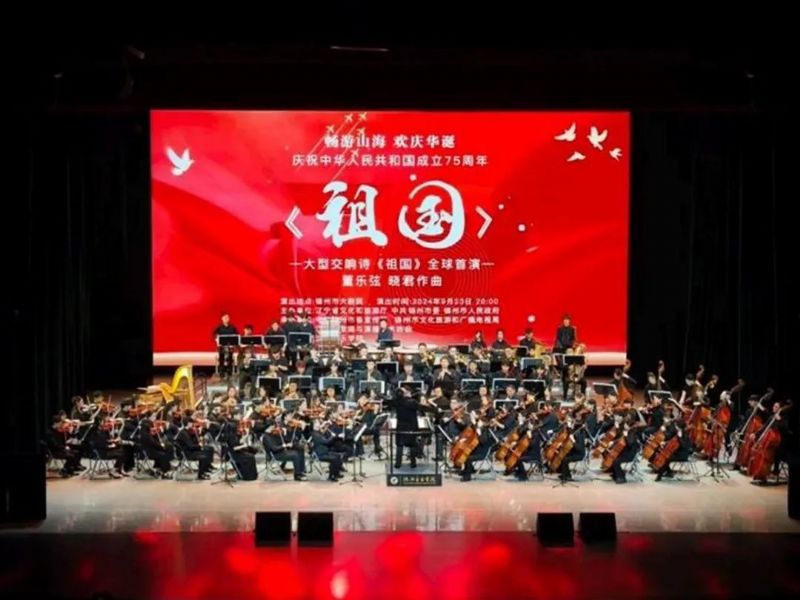 大型交响诗《祖国》由著名作曲家董乐弦与其学生、著名音乐人、国家一级导演、辽宁省歌唱与演播艺术协会主席晓君联合创作,倾情讴歌了中华民族向着民族复兴阔步前行的伟大进程,是对国家大力推动文化艺术发展、弘扬民族文化精神的积极响应,是对祖国华诞的深情献礼。此次首演由辽宁省文化和旅游厅、中共锦州市委、锦州市人民政府主办,中共锦州市委宣传部、锦州市文化旅游和广播电视局及辽宁省歌唱与演播艺术协会承办,我院北方交响乐团倾情演出。