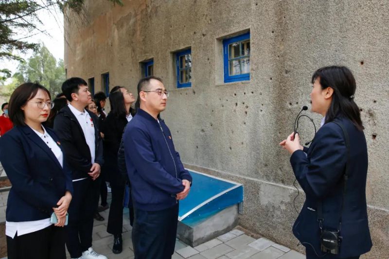 在配水池战斗遗址的“弹痕墙”前,配水池战斗遗址保护中心副主任郑芳以“解放配水池”为题,为全体师生讲授了一堂微党课,大家聚精会神的驻足倾听,低头深思,不时讨论交流,深刻感悟革命烈士在那个战火纷飞的岁月抛头颅、洒热血、攻坚克难、奋勇抗争的伟大精神。